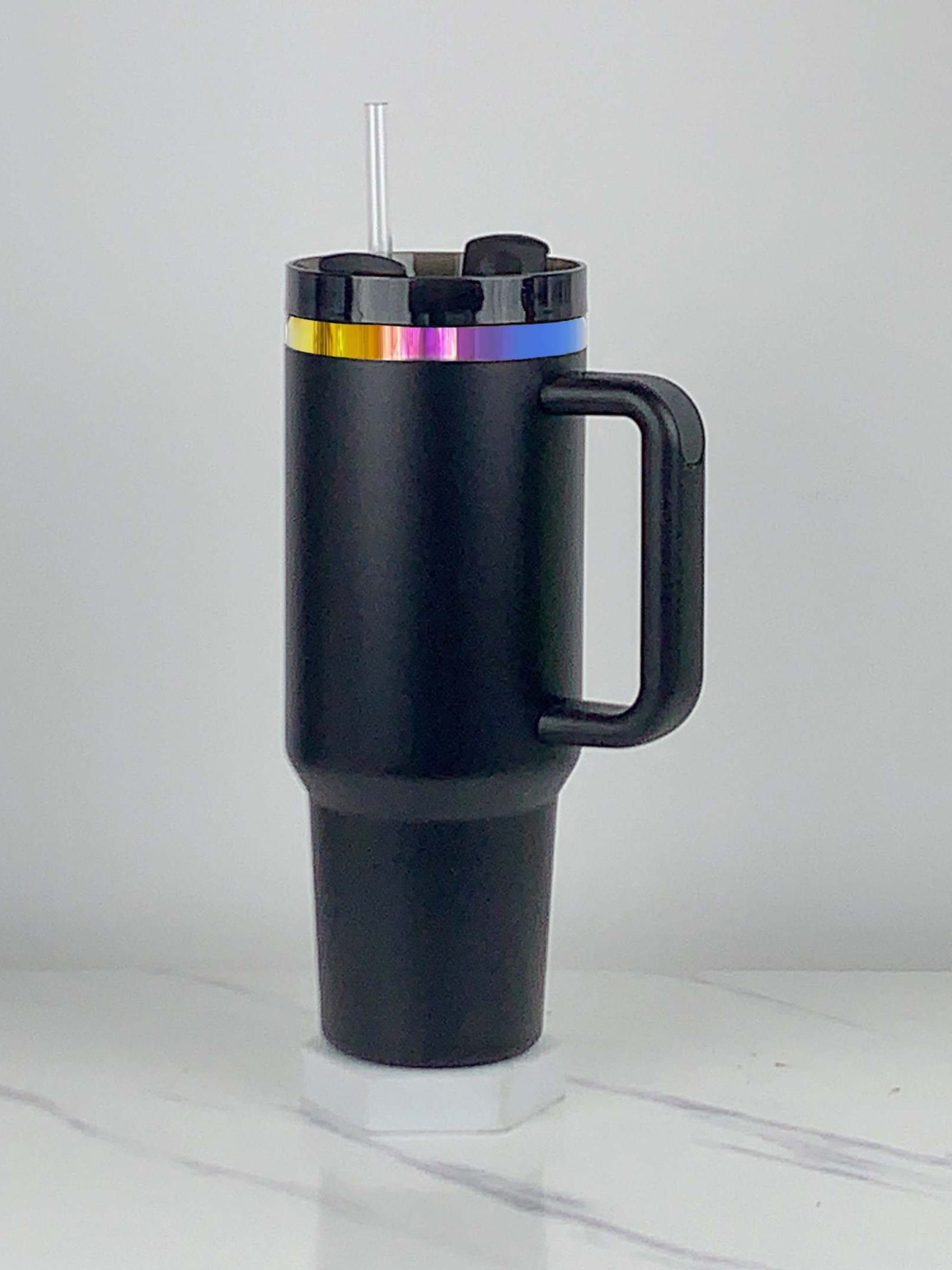 The 40oz Tumbler is a stainless steel insulated cup designed for comfort and convenience. It is car cup holder compatible and features a comfortable grip handle. The tumbler also includes a reusable straw, perfect for on-the-go refreshment. It's able to keep drinks cold for 11 hours and hot for 7 hours, making it the ideal companion for any adventure.